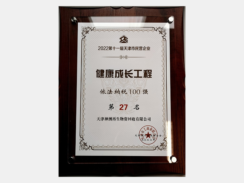 2022第十一屆天津市民營企業健康成長工程依法納稅100強第27名