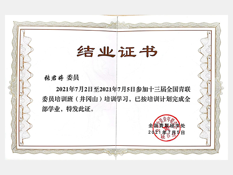 2021年7月2日至2021年7月5日參加十三屆全國青聯委員培訓班(井岡山)培訓學習(結業證書)
