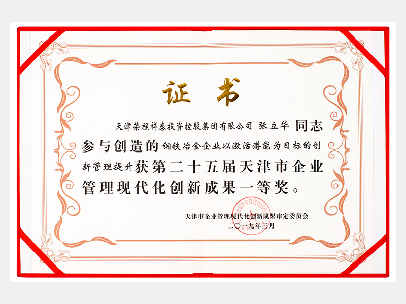 張立華同志參與創造的鋼鐵冶金企業以激活潛能為目標的創新管理提升獲第二十五屆天津市企業管理現代化創新成果一等獎。