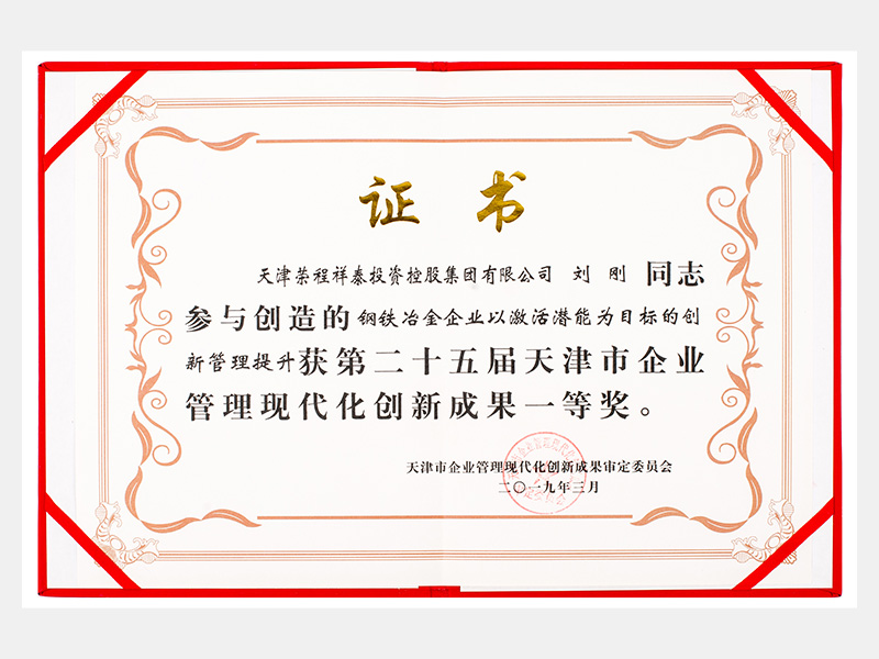劉剛同志參與創(chuàng)造的鋼鐵冶金企業(yè)以激活潛能為目標的創(chuàng)新管理提升獲第二十五屆天津市企業(yè)管理現(xiàn)代化創(chuàng)新成果一等獎。