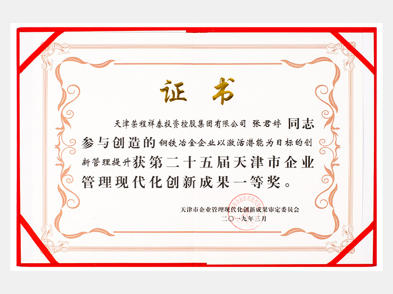張君婷同志參與創造的鋼鐵冶金企業以激活潛能為目標的創新管理提升獲第二十五屆天津市企業管理現代化創新成果一等獎。