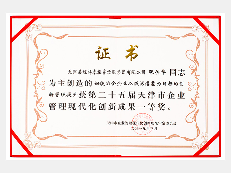 張榮華同志參與創造的鋼鐵冶金企業以激活潛能為目標的創新管理提升獲第二十五屆天津市企業管理現代化創新成果一等獎。